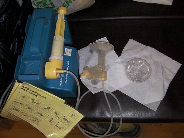 <<<慈濟借來的美樂醫院專用吸乳器,最右邊是我們自備的矽膠胸墊>>>